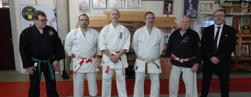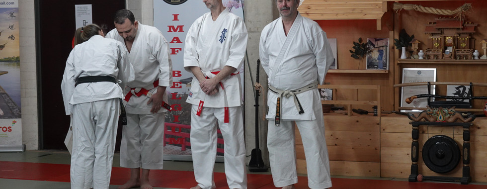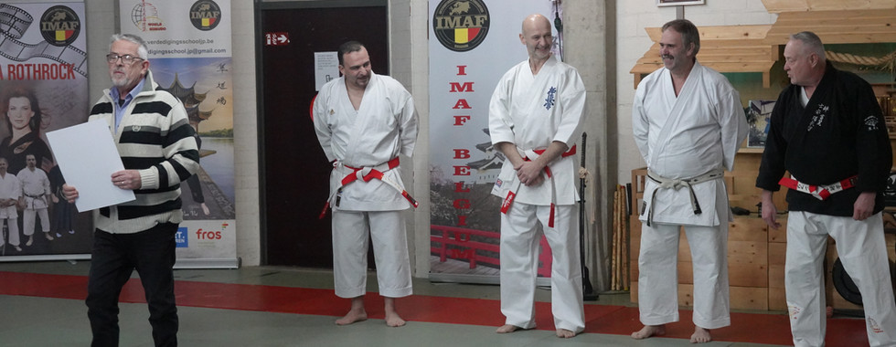 Het ceremoniële gedeelte van de training was een belangrijk moment. Marcel Morton werd geëerd met de prestigieuze titel van Renshi in Karate Shotokan, een erkenning voor zijn toewijding en vaardigheden. Vader en dochter, Mark en Shelsey Vandamme, ontvingen hun 1ste DAN Karate Shotokan, een belangrijke mijlpaal in hun karatereis. Sensei Roger Lemaire werd door IMAF-België erkend met zijn 2de DAN Kenjutsu, wat zijn meesterschap in deze traditionele Japanse zwaardkunst bevestigde.
